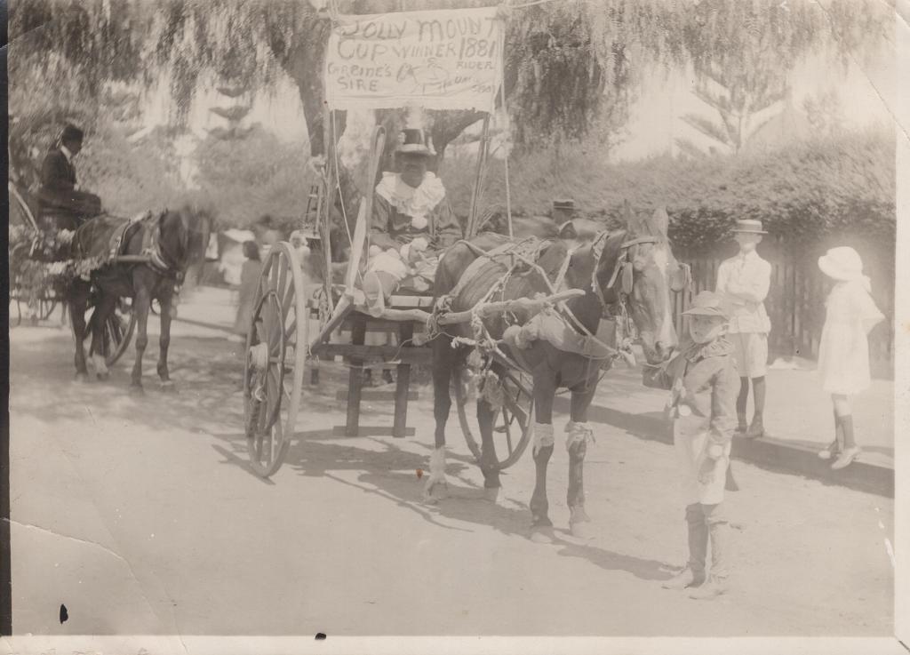 c. 1930Image: A photograph of a procession of horsecarts travelling down a street. There are people lining the street, mostly children. The horse and cart in the centre of the image has a banner mounted above the cart, with the writing 'JOLLY MOUNT CUP WINNER 1881. GREINE'S CIRE. RIDER: UNCLE SAM.' The man driving the cart has a black tophat and white frilled collar. At the front of the horse is a young boy holding the reigns. Behind the cart is another horse and cart, with a man wearing a dark suit and bowler hat driving.