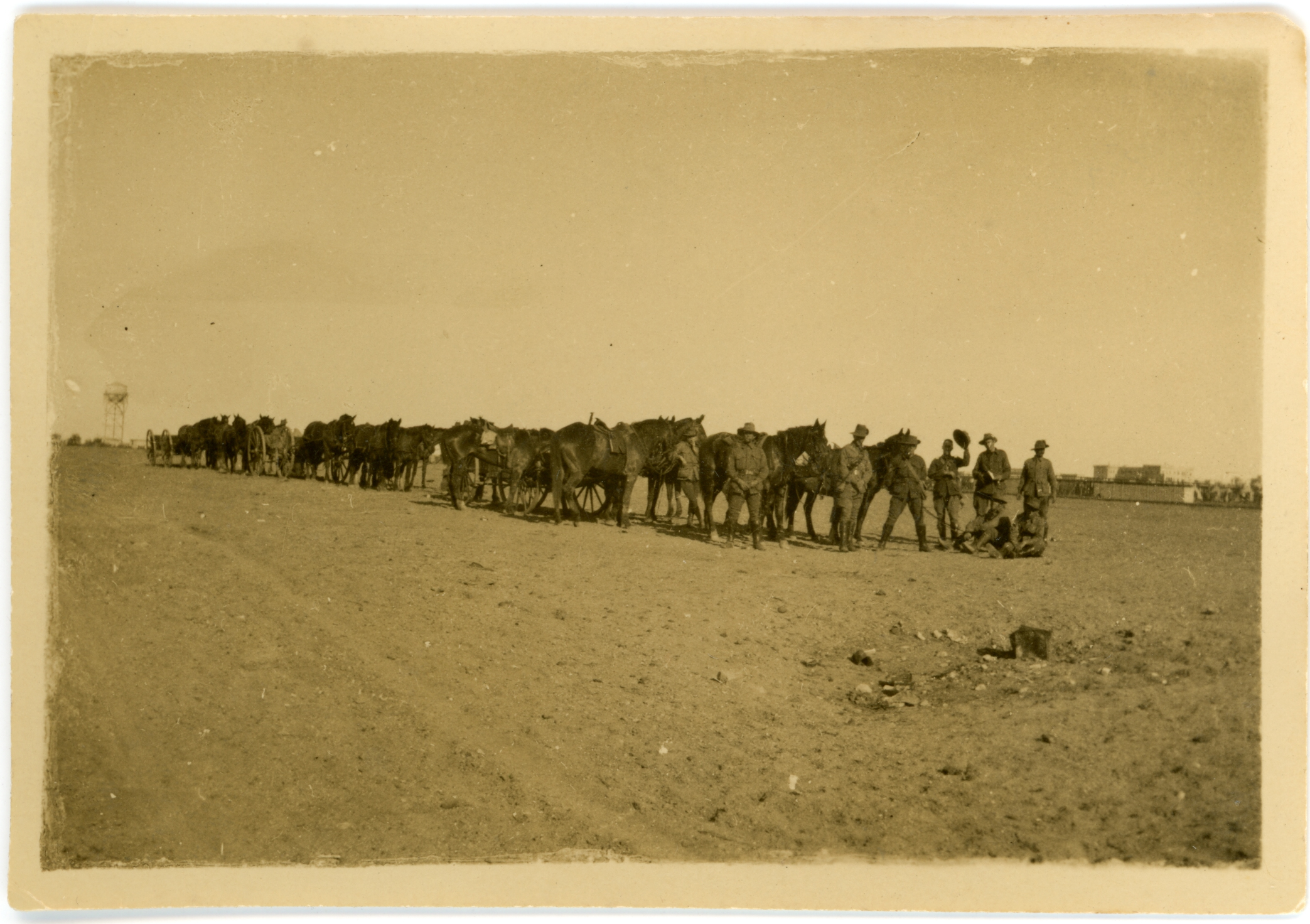 1916 - 1918A small black and white photograph showing nine Light Horsemen standing or sitting in front of their horses. In the picture are also supply wagons and machine gun carriers pulled by horses. The picture appears to have been taken in a camp as there are buildings and a water tower in the background. The image has a small border and the photograph is in good condition with no staining front or back.