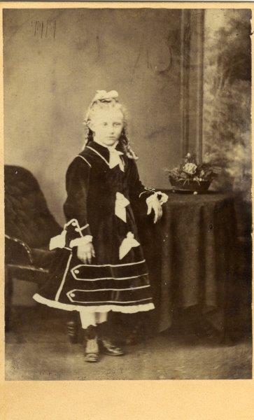c. 1880B/W print of a sepia studio portrait of a young girl. She is wearing a dark frock trimmed with white braid, bows and edging, white stockings and dark boots. Her hair is pulled back from her face, caught with a bow and falls over her shoulder in tight ringlets. She is standing in front of a deep-buttoned chair and her left arm rests beside a floral arrangement on a table covered in a long cloth.