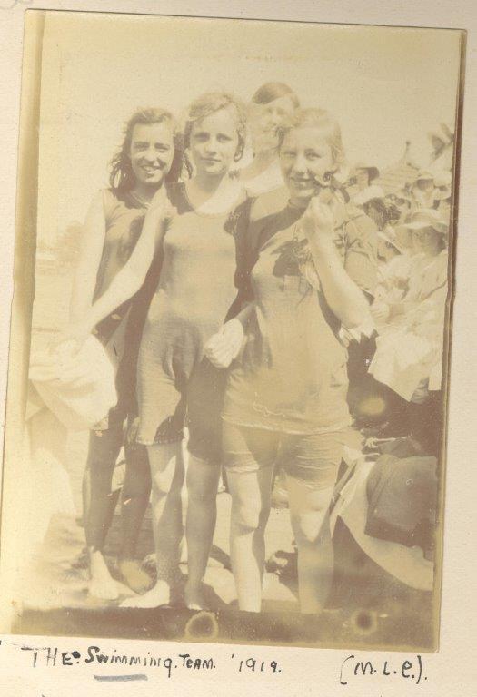 1918Two sepia prints. (a) A lawned area with students in summer uniform and light hats standing in groups in front of a tall hedge. There is the corner of a building and tall trees in the background. Beneath [Physical Culture -drill : 1918 ] (b) Four girls in round necked, short legged bathers. The one on the right has a separate top with short sleeves. Sitting behind them are students in summer uniform and hats. Beneath [The Swimming Team 1919 (M.L.C.)].