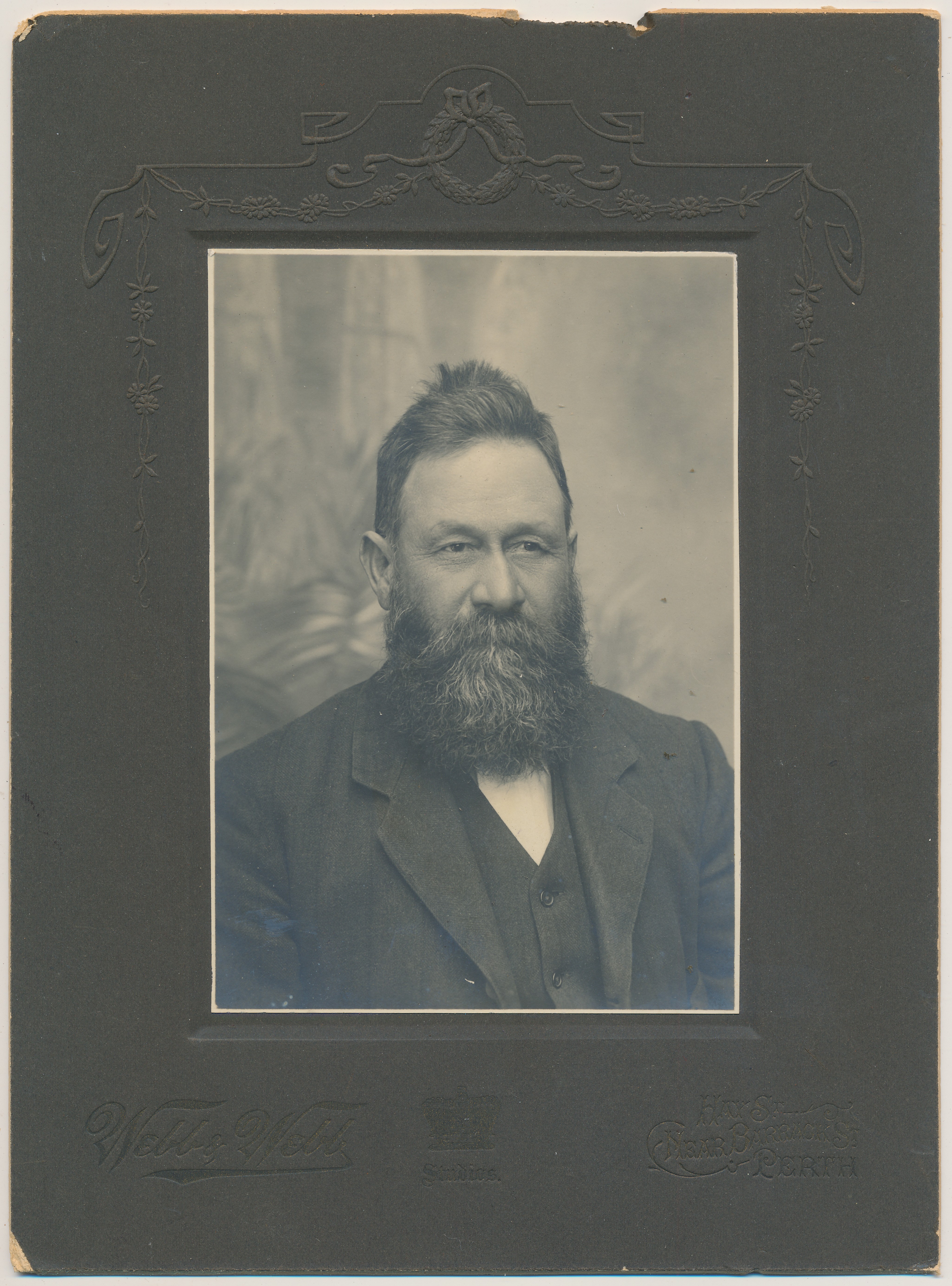 A sepia head and shoulders photograph of a young man with a moustache and full beard. He is dressed in a jacket, vest and white shirt. The photograph is in a dark brown mount.