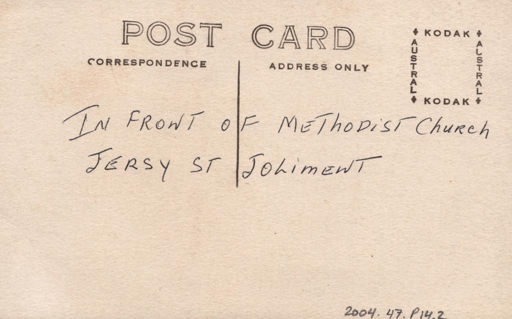 Reverse: Written in black pen 'IN FRONT OF METHODIST CHURCH JERSY ST JOLIMENT' (Jolimont)