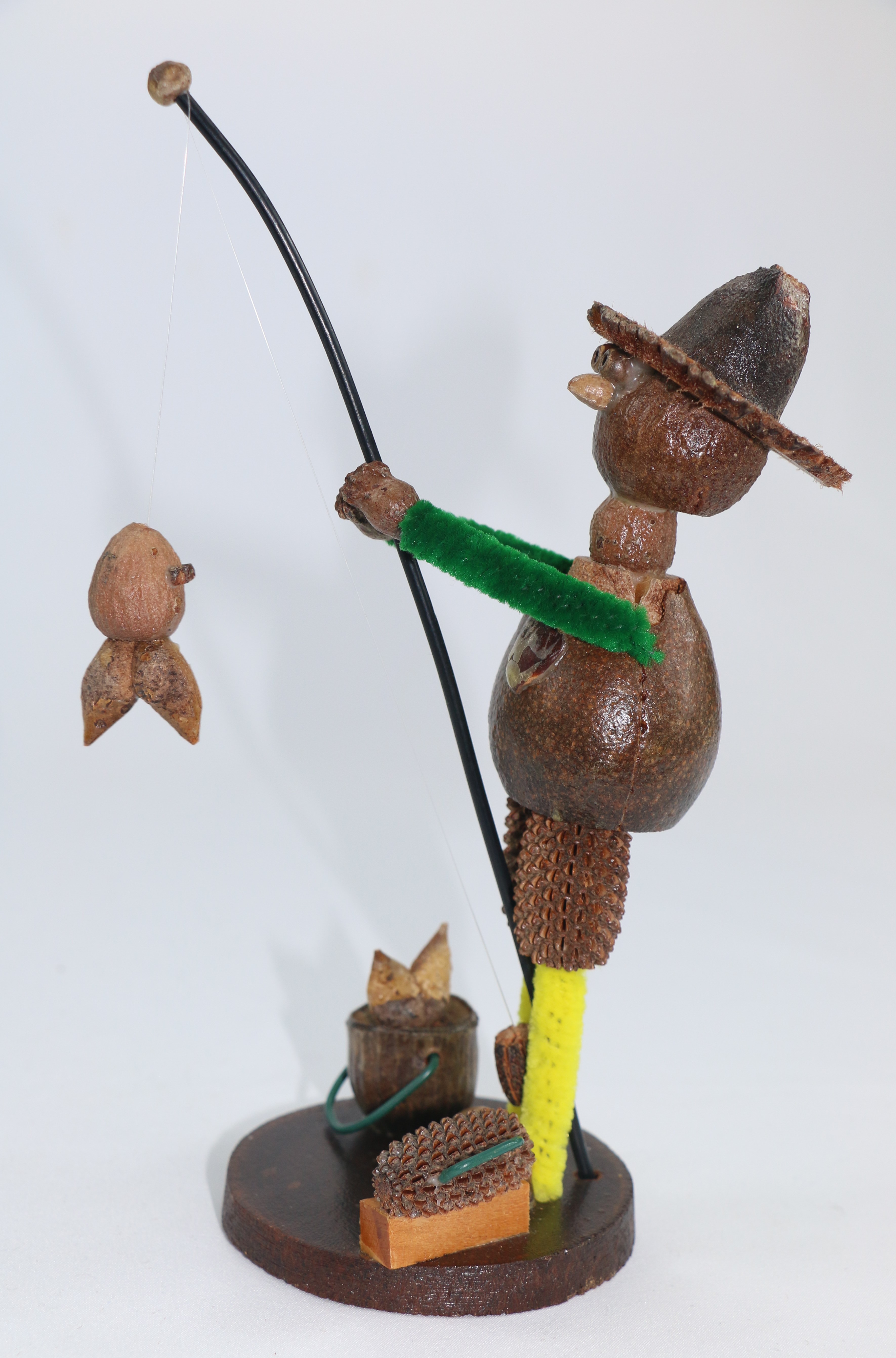 Gum nut figurine fashioned in the style of a fisherman. The figurine is made of gumnuts and has yellow pipe cleaners for legs and green pipe cleaners for arms. The figurine is glued on a cross-cut section of wood that is varnished. The 'fisherman' is holding a length of plastic or nylon 'line' with caught fish on rod. A gumnut stylised as a bucket with plastic handle and a box with plastic handle for bait, hooks etc. is resting on base.