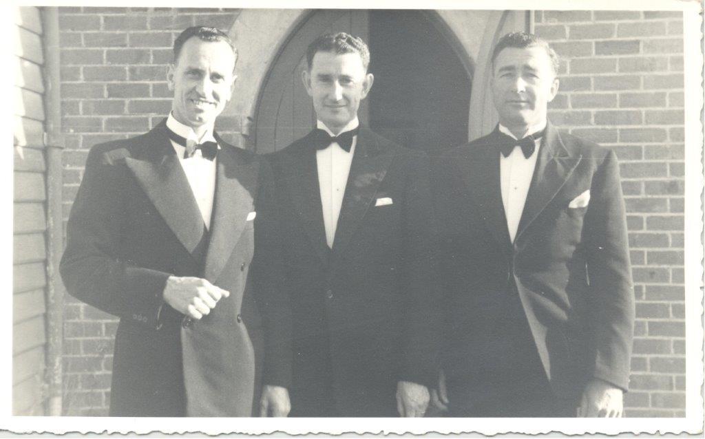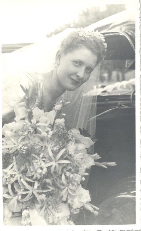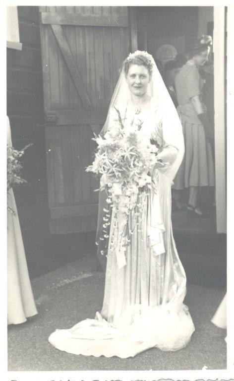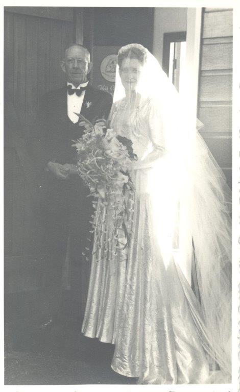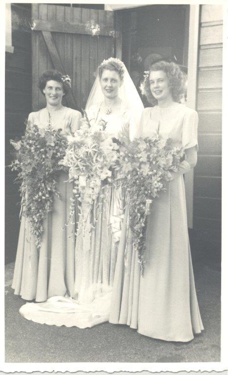 B/W Prints. (a) Thelma Mercer, in wedding dress and veil and holding large bouquet, is entering a dark car. (b) Thelma Mercer and father, Horrie, in doorway of church. (c) Thelma Mercer, with veil and train arranged at her feet, in front of church doorway. Guests in background. (d) Thelma Mercer and her two bridesmaids in front of church doorway. (e) Groom, Dudley Barton, with best man and groomsman outside the church. All are wearing dark suits, dress shirts and black bow ties.