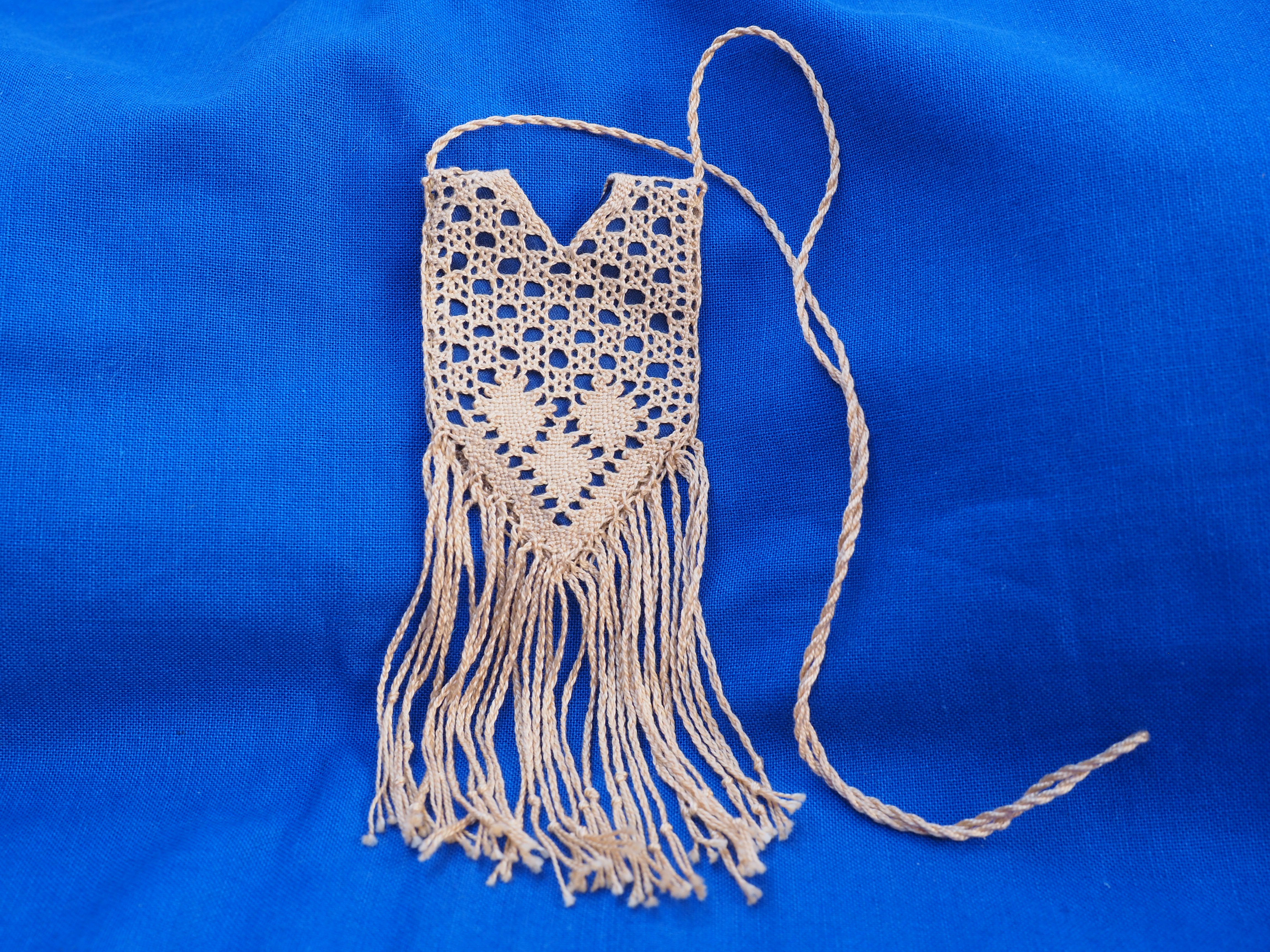 A Guild lace maker made this unusual bobbin lace amulet in early 2000s. Lined with silk, it has a twisted cord handle and a chain stitch crochet fringe.