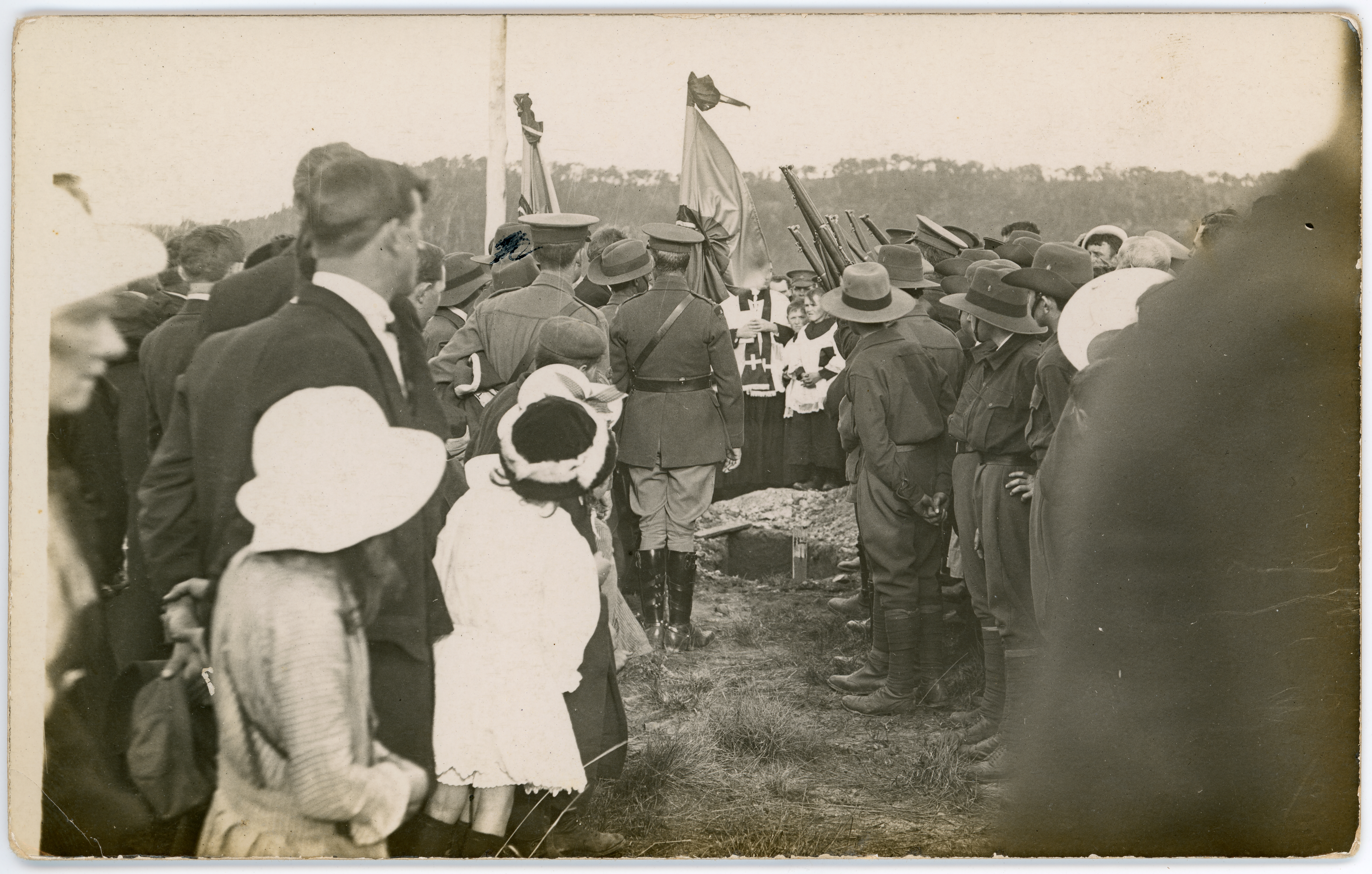 Photograph shows a crowd at a military funeral, soldiers and civilians. Possibly linked to previous photos in collection of the funeral of Pte. J. KING, which Pte. BANNISTER attended in Lithgow, NSW.
