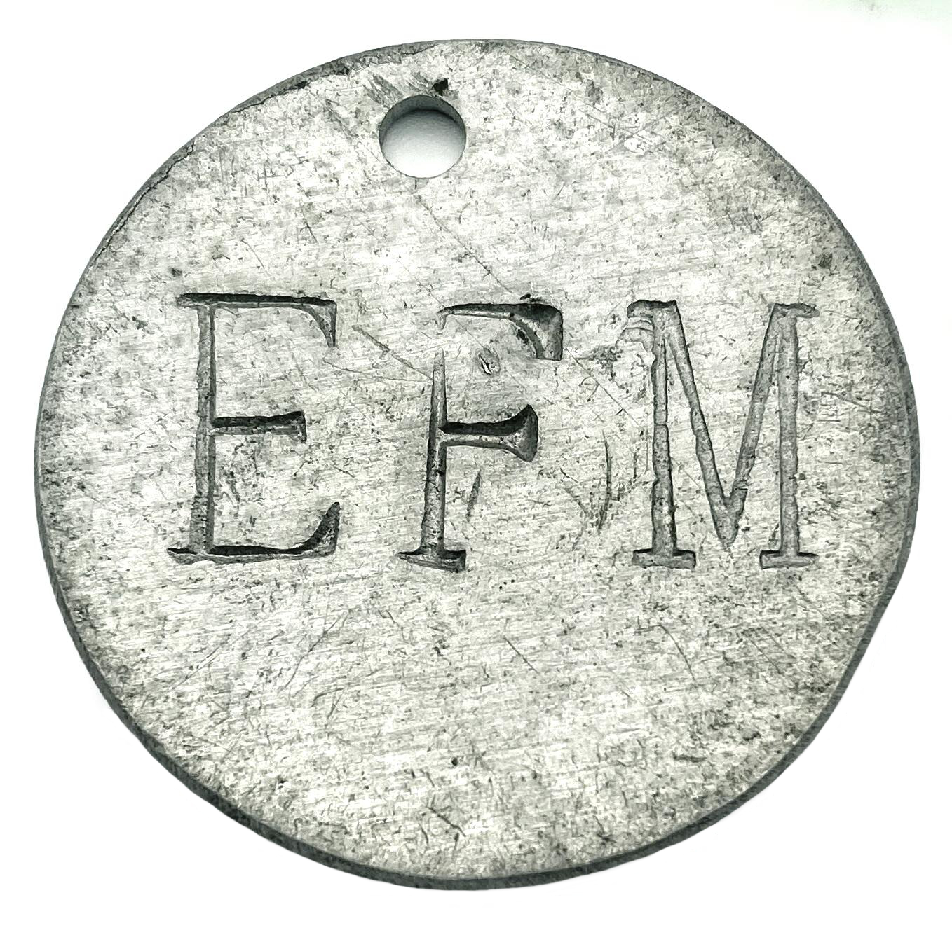 It is circular in shape with a small hole at the top for hanging. It has the letters 'EFM' stamped on the front. The back surface has no markings.
