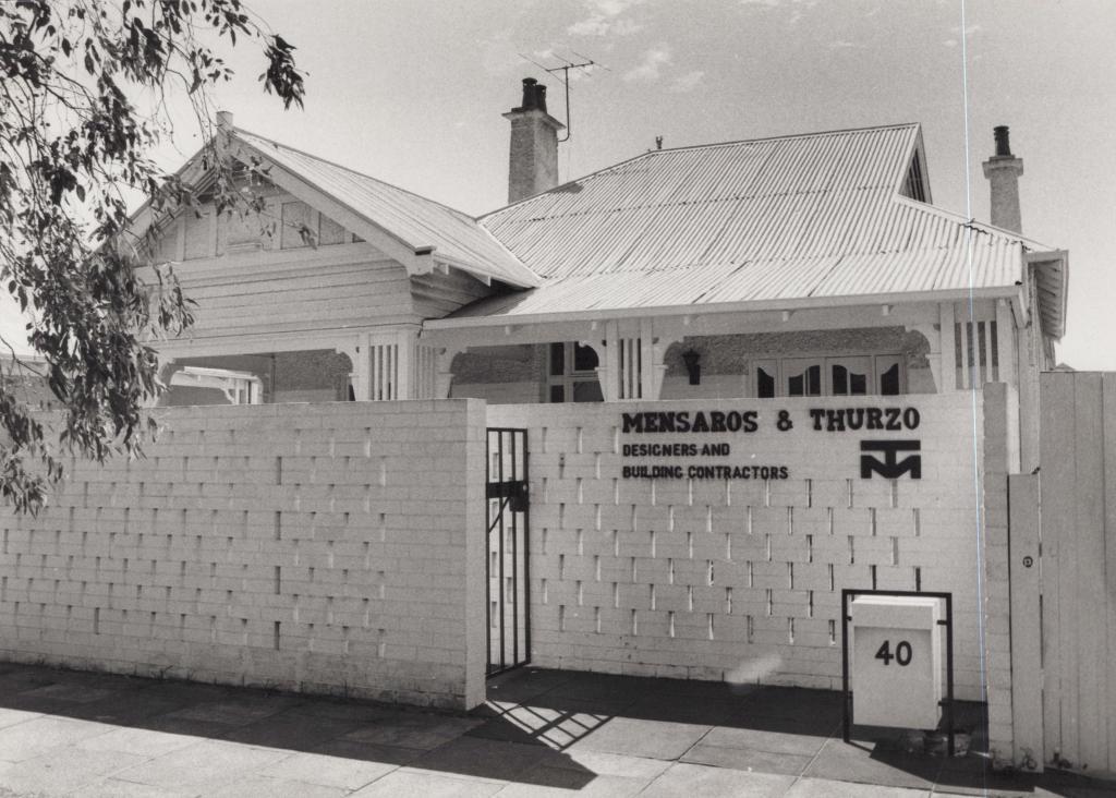 1985Black and white photograph of a house at 40 Hamersley Road. Most of the house is covered by a brick wall. The text 'MENSAROS & THURZO DESIGNERS AND BUILDING CONTRACTORS' is seen in black letters on the wall. There is a black metal gate on the wall leading to the house. There is a gable to the left in the image with a small finial fixed on top. There is a verandah supported by decorated wooden beams. There are two chimneys. There is a post box to the bottom right with the number '40' in black digits.