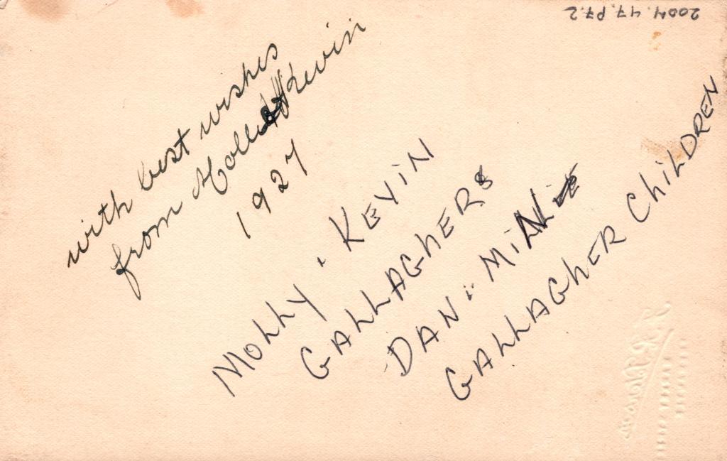Reverse: Written in black pen 'with best wishes from Molly & Kevin 1927' and 'MOLLY & KEVIN GALLAGHER DAN & MILLIE GALLAGHER CHILDREN'