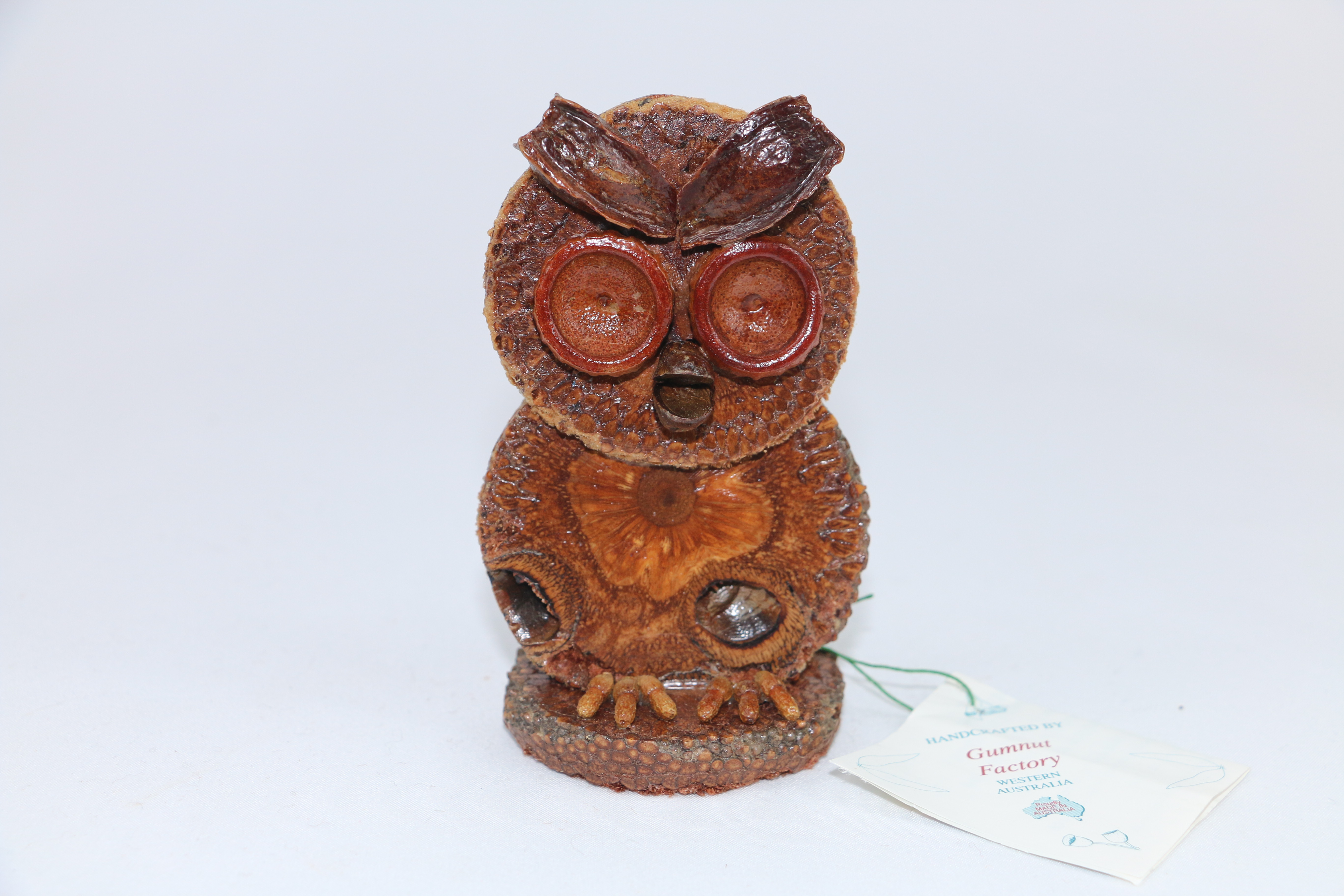 Gumnut owl toothpick holder made of Banksia nut cross cut section glued together as an 'owl'. Seedpods on the 'head' denote eyes, mouth and brow. Feet are also of seed pods. A gumnut is positioned at the rear. The figurine is varnished in clear lacquer. Attached to the feel is a small square paper card.