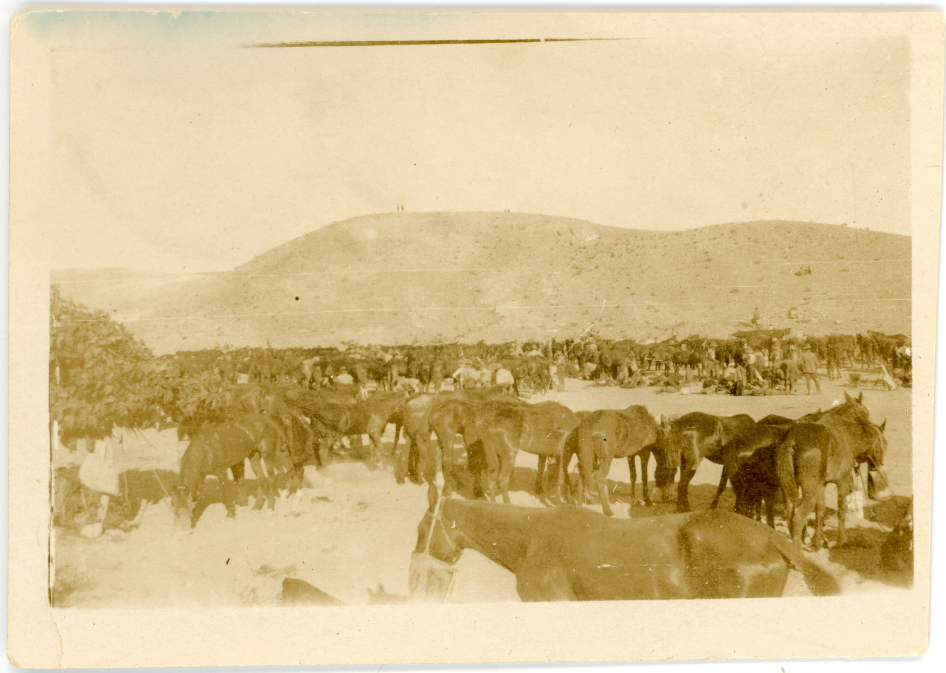 1916 - 1918A small black and white photograph of a desert camp showing a group of horses in the forefront wearing nosebags and tethered at the head. Behind the horses there are a large group of soldiers with their horses. At the rear of the image is a large hill. The photograph has a small border and is in good condition although there is a blue mark at the top left edge. There is a small number 1 written on the reverse top corner.