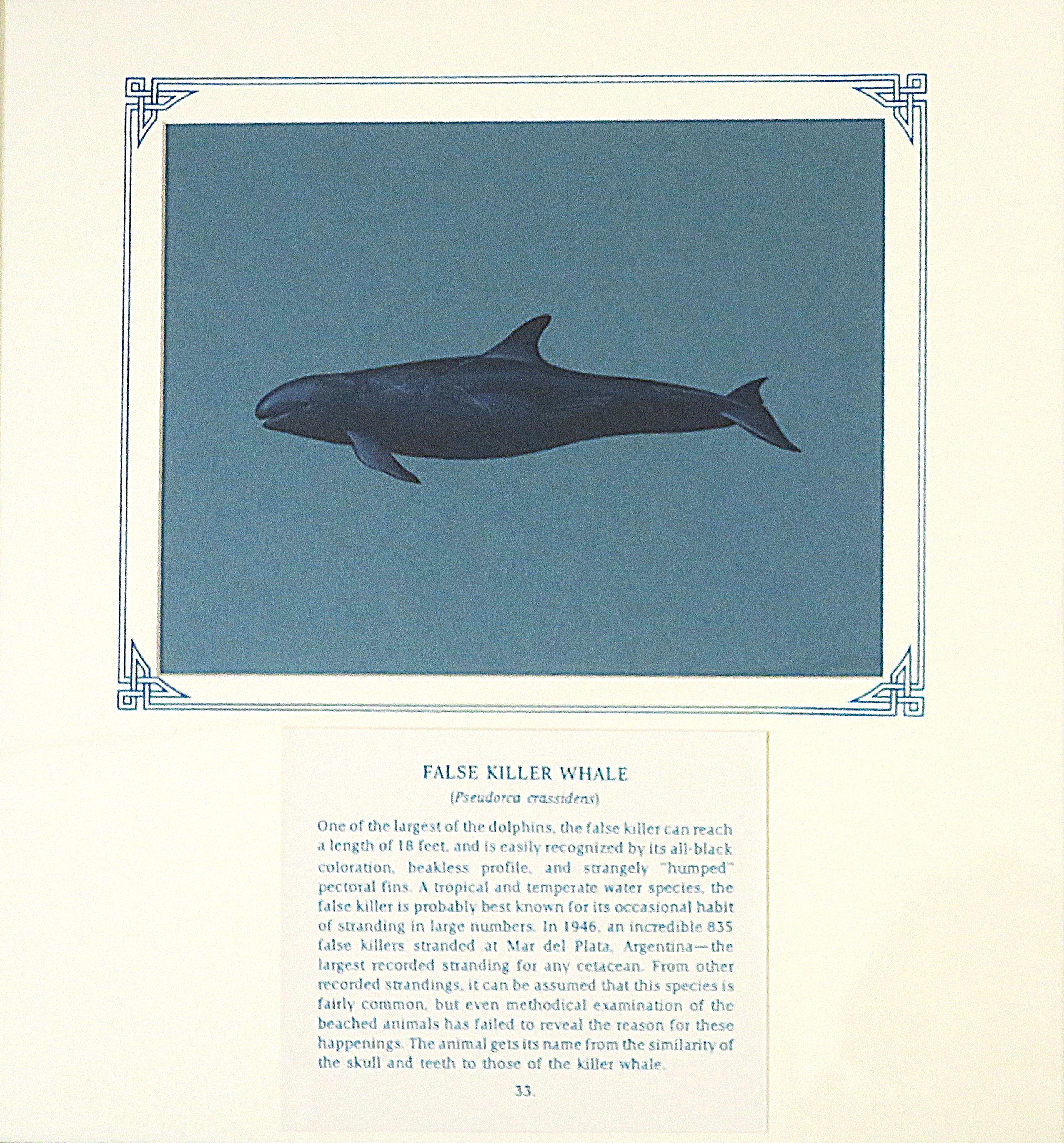 One of the largest of the dolphins, the false killer can reach a length of 18 feet, and is easily recognized by its all-black coloration, beakless profile and strangely "humped" pectoral fins. A tropical and temperate water species, the false killer is probably best know for its occasional habit of stranding in large numbers. In 1946, an incredible 835 false killers stranded at Mar del Plata, Argentina- the largest recorded stranding for any cetacean. From other recorded strandings, it can be assumed that this species is fairly common, but even methodical examination of the beached animals has failed to reveal the reason for these happenings. The animal gets its name from the similarity of the skull and teeth to those or the killer whale.