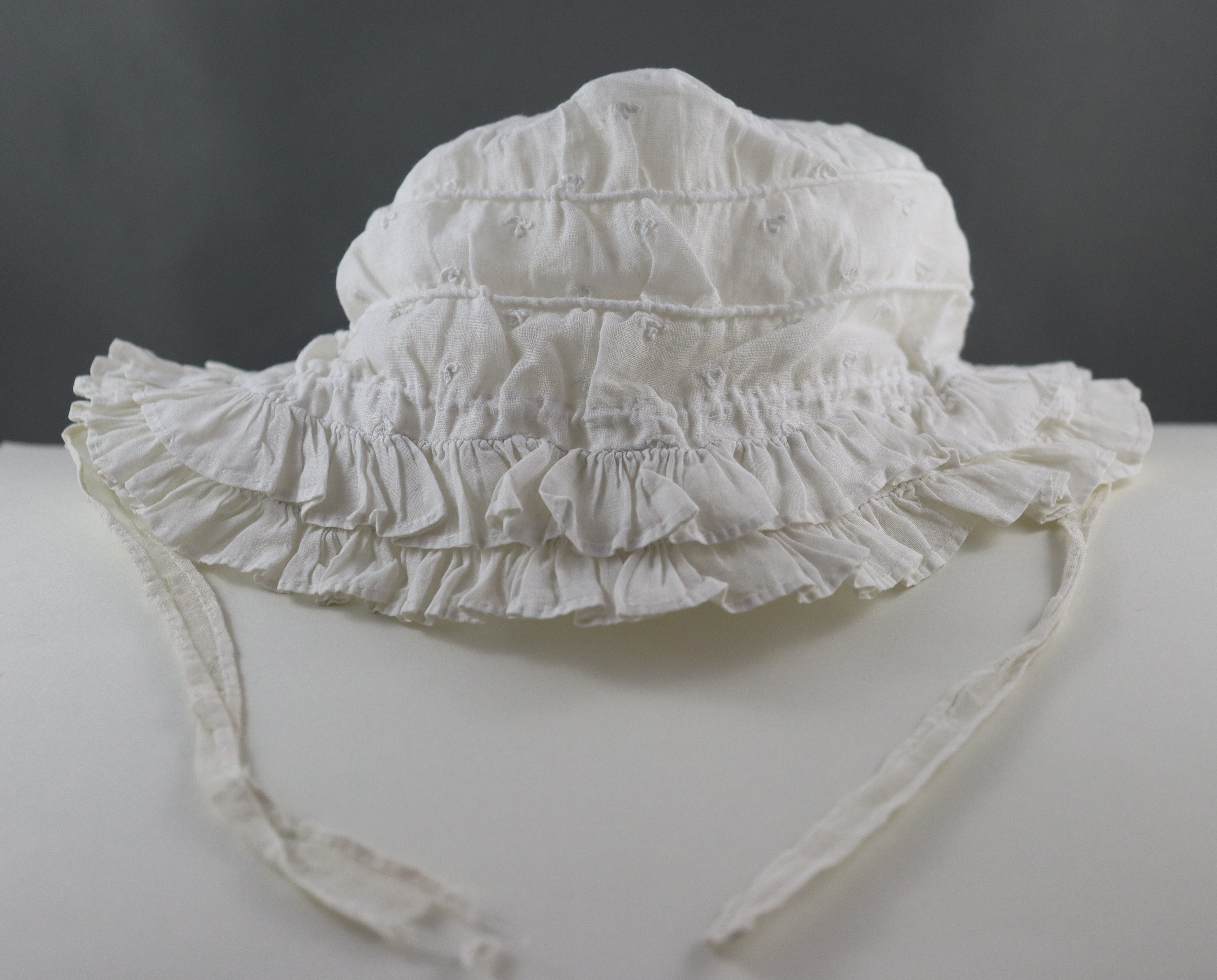 c. 1920A white hand sewn baby's bonnet. There are three rows of draw cotton threads around the crown. There are two rows of frill around the front and one at the back with two neck ribbons to tie under the chin. There are French knots embroidered on the crown and in each row of the cotton threads.