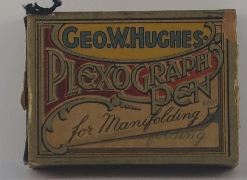 On the top of the box in green lettering on a yellow background is "GEO W HUGHES." and underneath in gold lettering on a red background is "PLEXOGRAPH PEN", underneath in black lettering is "for Manifolding".