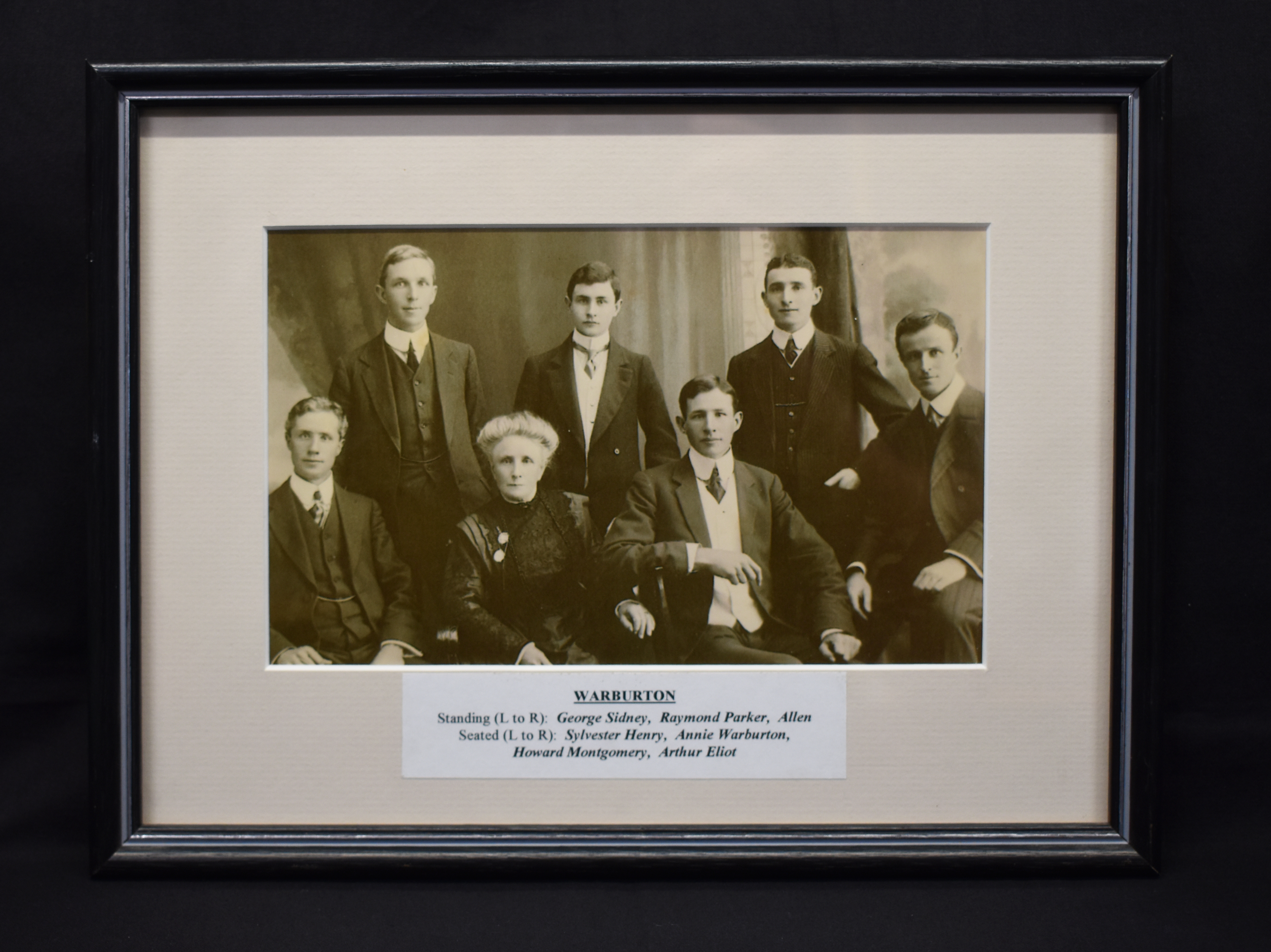 On front “WARBURTON / Standing (L to R): George Sidney, Raymond Parker, Allen / Seated (L to R): Sylvester Henry, Annie Warburton, / Howard Montgomery, Arthur Eliot”. On back “WARBURTON / Standing (L to R): George Sidney, Raymond Parker, Allen / Seated (L to R): Sylvester Henry, Annie Warburton, / Howard Montgomery, Arthur Eliot” with “DV GANTER PTY LTD / 11 Kate Street / Turramurra NSW 2074 / APR. ’03 / 9144 2924, 9144 5033 / Fax: 9449 6775 / FRAME”. Also has “WARBURTON” family crest sticker on the right side.