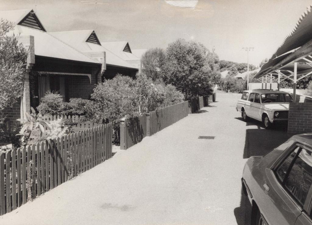 1985Black and white photograph of unknown houses at Troy Terrace. There are brick houses to the left in the image. All the houses have small gables on top of the roof. There are wooden picket fences with wooden gates surrounding each of the houses' gardens. There are bushes and trees in the gardens in front of the houses, partially covering the houses. There is a road going past the houses. There are two cars parked to the right of the road, beneath a metal roof supported by beams. The cars are separated by brick walls. There is an electrical pole behind the last car. There are trees and bushes in the background of the image, to the right.
