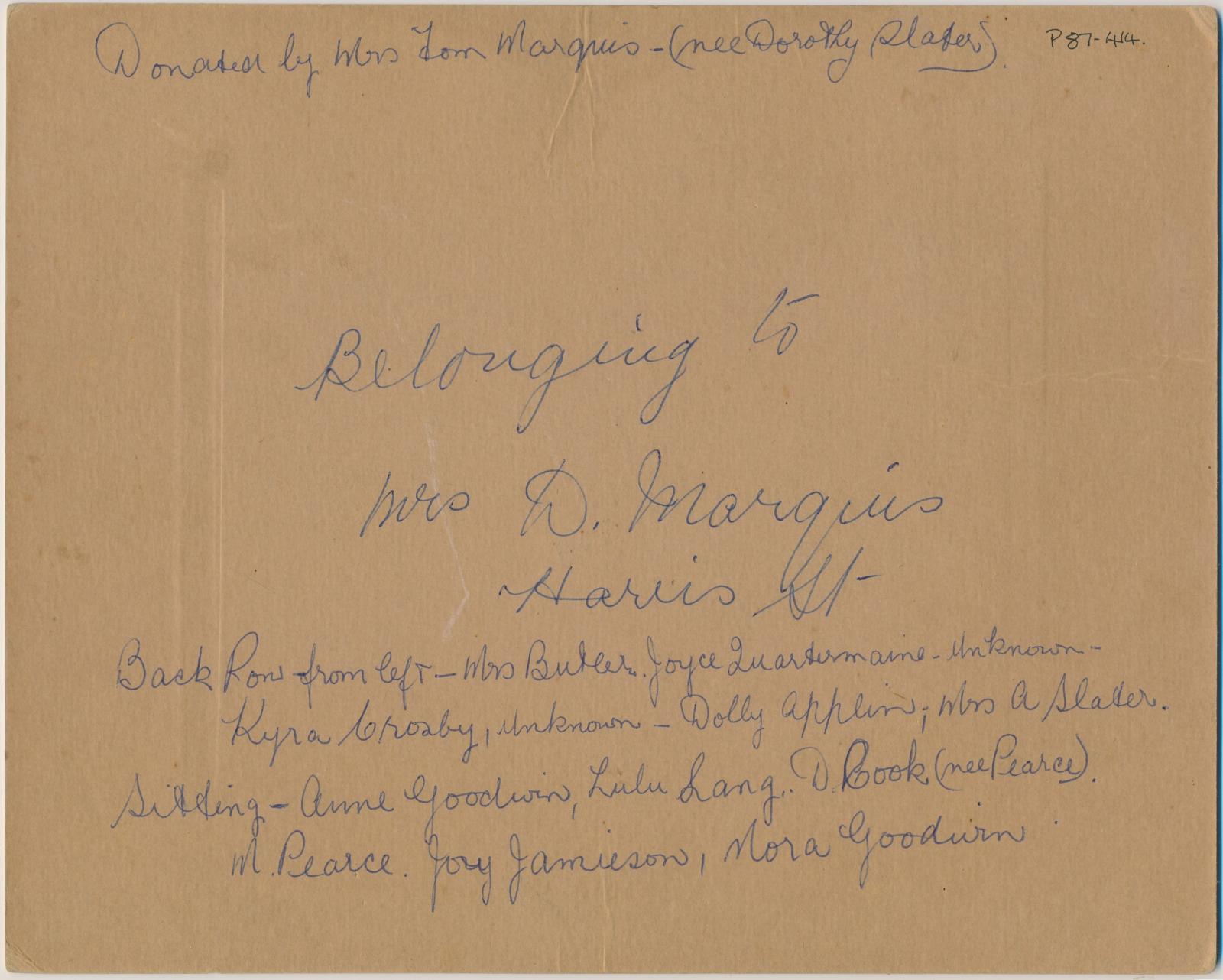 On the back of the photograph handwritten in blue ink is "Donated by Mrs Tom Marquis - (nee Dorothy Slater) Belonging to Mrs D.Marquis Harris St". and underneath this is " Back row from left - Mrs Butler. Joyce Quartermaine, Unknown, Kyra Crosby, Unknown- Dolly Applin, Mrs A Slater. Sitting Anne Goodwin Lulu Land, D Cook (nee Pearce0, M. Pearce. Joy Jamieson, Nora Goodwin."