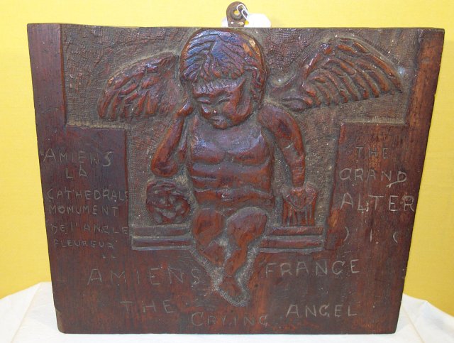 c. 1918Square block of wood that has been naively hand carved in bas relief. It shows an angel with one elbow resting on a skull and the other hand resting on an hourglass. To The left of panel is carved "Amiens / LA / CATHEDRALE / MONUMENT / DE / L' ANGLE / PLEUREURl ". Carved beneath the angel is "AMIENS FRANCE / THE CRYING ANGEL ". To the right of panel "THE / GRAND / ALTER ". {sic} . Metal piece at centre top with which to hang it.
