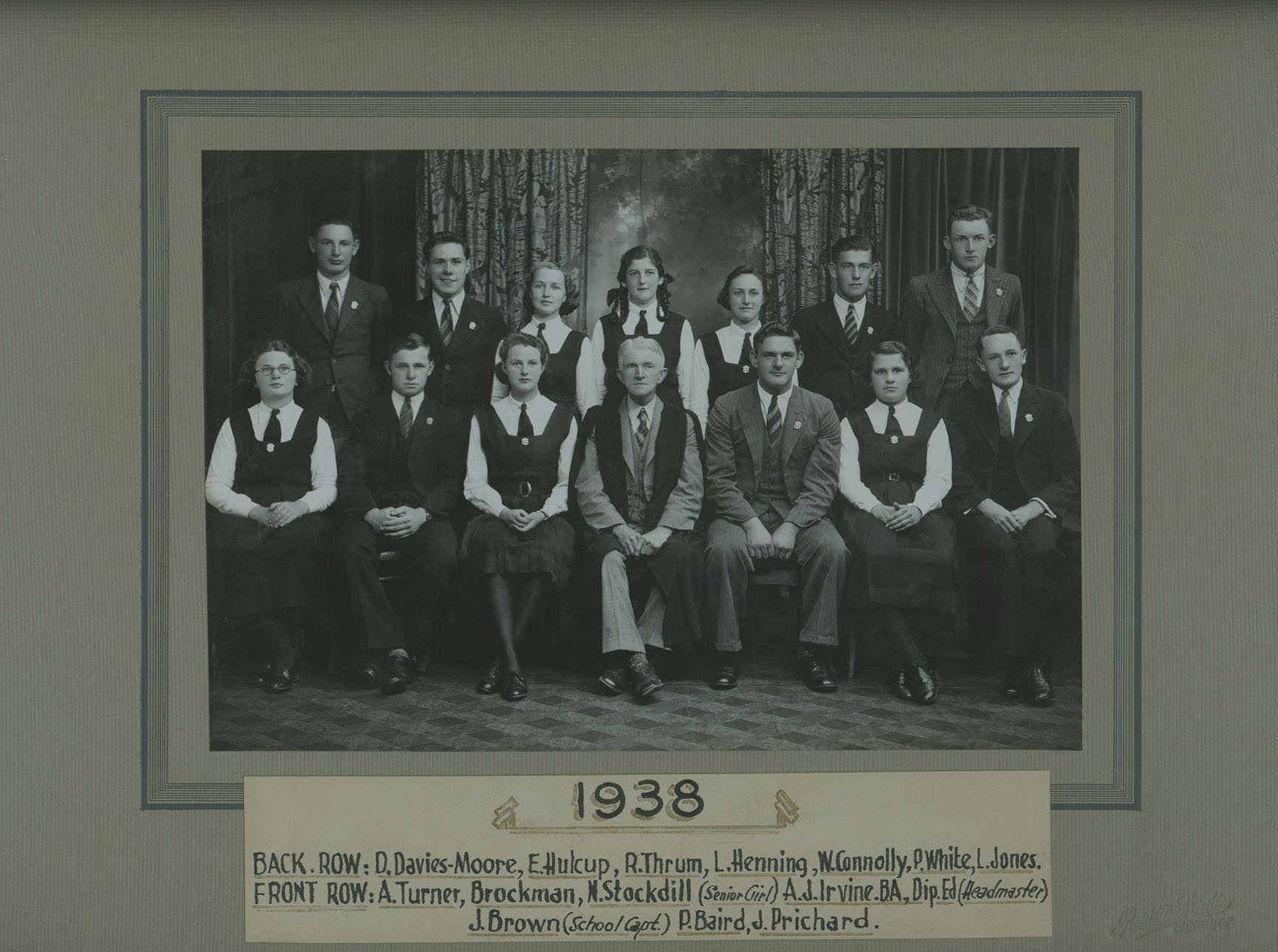 1938Studio portrait of the 1938 Bunbury High School Prefects with headmaster Arthur J Irvine.