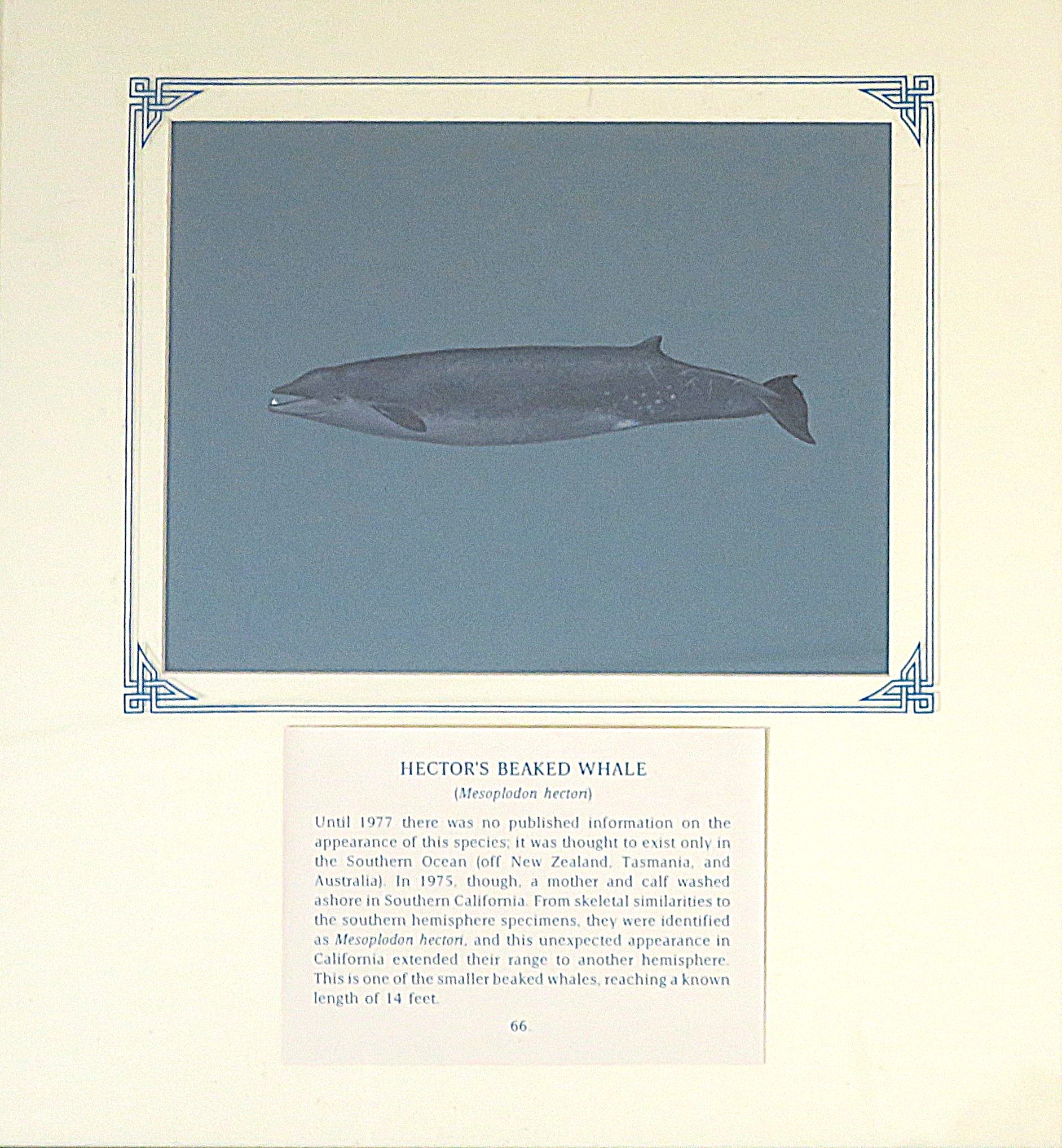 Until 1977 there was no published information on the appearance of this species; it was thought to exist only in the Southern Ocean (off New Zealand, Tasmania, and Australia). In 1975, though, a mother and calf washed ashore in Southern California. From skeletal similarities to the southern hemisphere specimens, they were identified as Mesoplodon hectori, and this unexpected appearance in California extended their range to another hemisphere. This is one of the smaller beaked whales, reaching a known length of 14 feet.