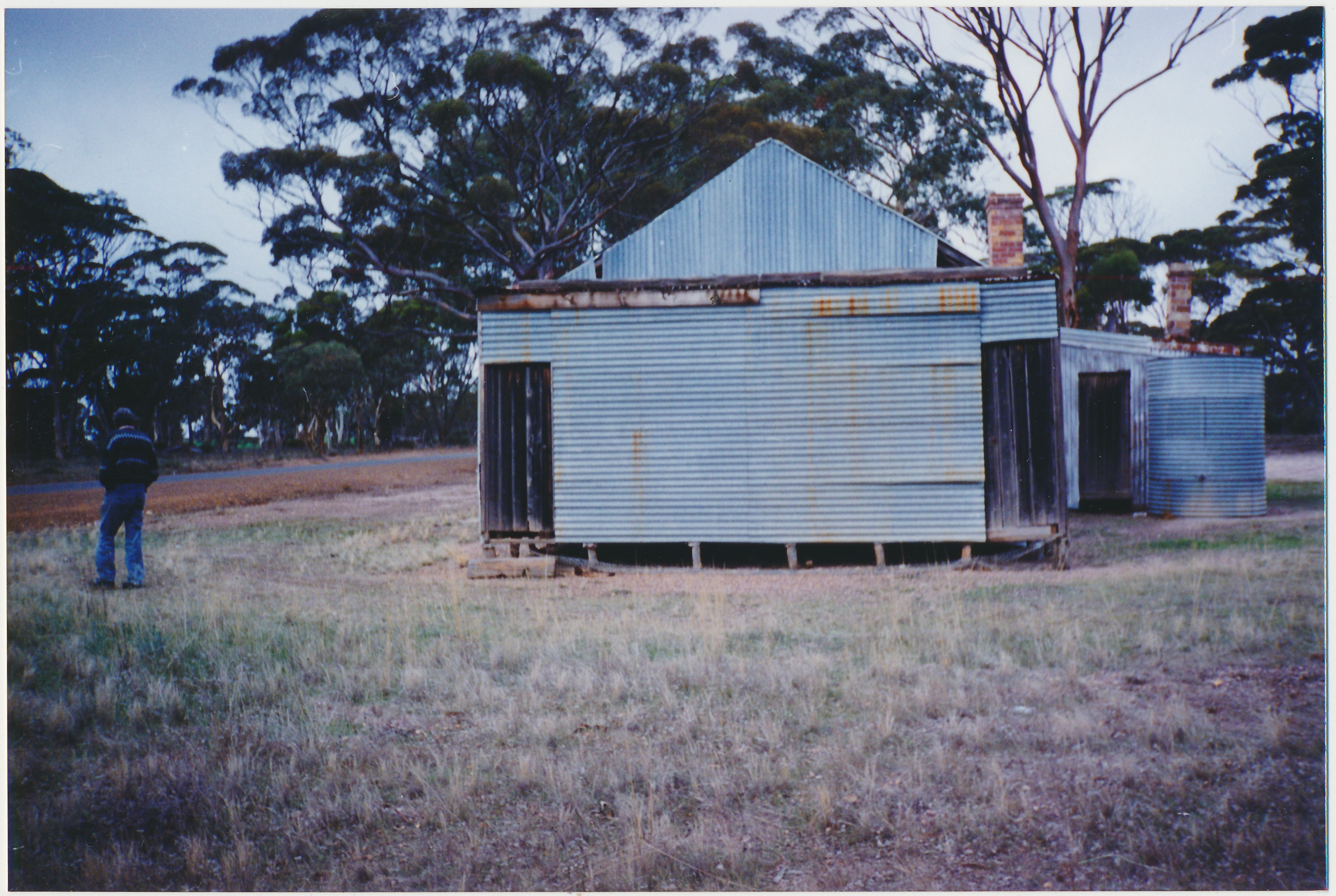 c. 1995A coloured photograph of one of the entrance ends of a tin building. On the right hand side of the photograph the water tank is visible and the brick chimney is visible.