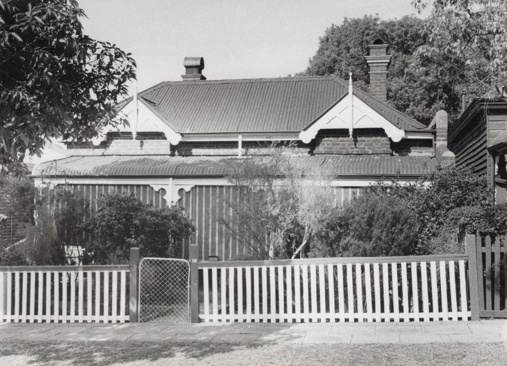 1985Black and white photograph of a house at 16 Francis Street. It is a brick house. The house is symmetric. There are two white gables with finials fixed on top, one gable to the left and one to the right. There is a brick chimney. There is another chimney to the left. There is abull nosed verandah with a tin roof supported by white decorated wooden beams. There is a white picket fence with a wired metal gate in front of the house. The number '16' is seen to the right of the gate.There are bushes and trees partially covering the house. There are large trees in the background. There is a wooden house to the right in the image.