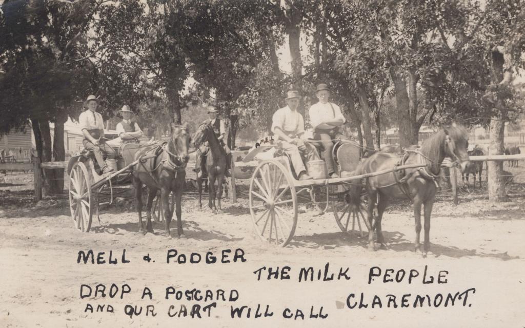 c. 1913Postcard showing an outdoor scene. Multiple horses with carriages are seen. People are seen on the carriages. Trees are seen in the background. There is some text on the postcard, reading: 'MELL & PODGER', 'THE MILK PEOPLE CLAREMONT' and 'DROP A POSTCARD AND OUR CART WILL CALL'.