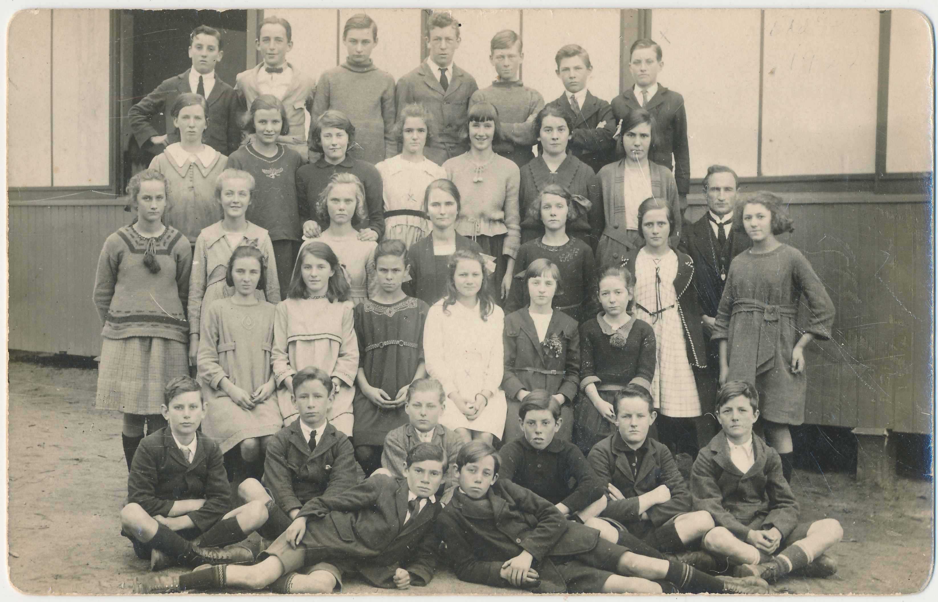 c. 1915A sepia photograph of school children with their teacher in five rows. The postcard was inside an envelope which has the full names of most of the girls written on the envelope.