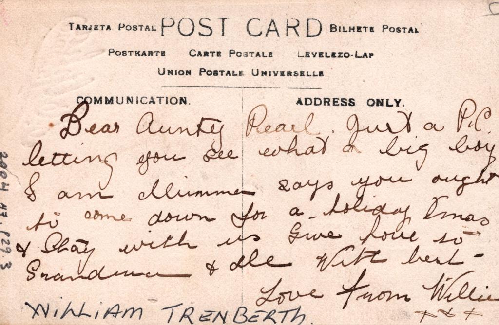 Reverse: Written in black pen is text starting with 'Dear aunty Pearl' and ending with 'Love from Willie',' and 'WILLIAM TRENBERTH'