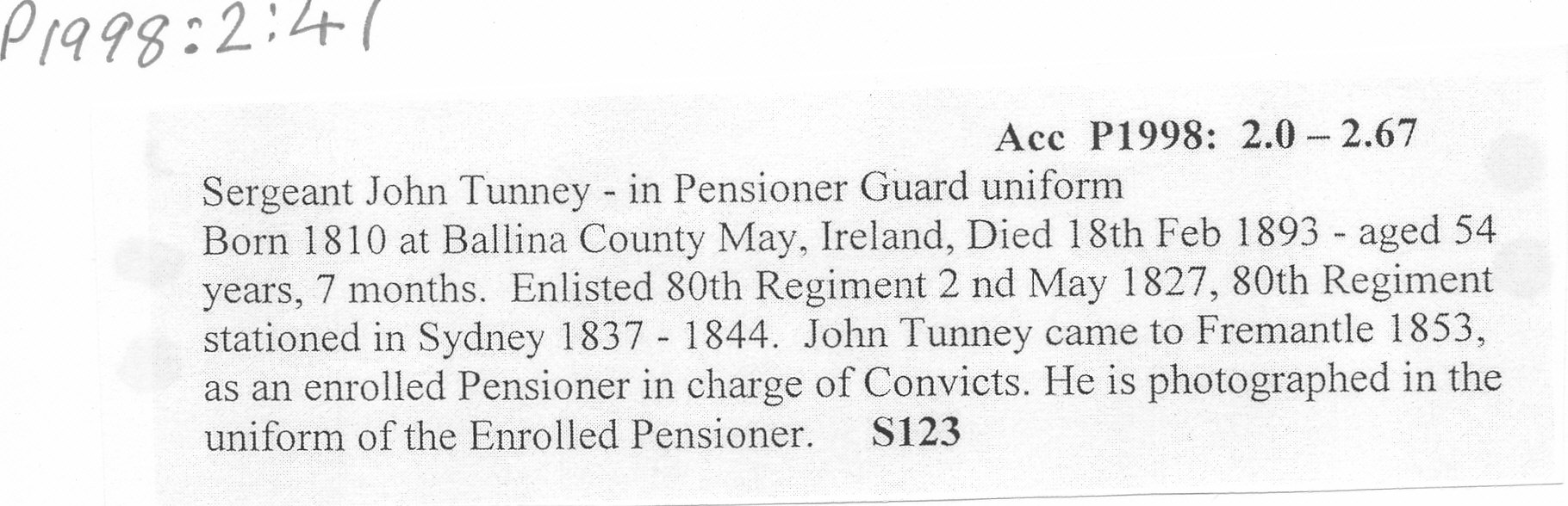 Sergeant John Tunney - in Pensioner Guard uniform Born 1810 at Ballina County May, Ireland, Died 18th Feb 1893 - aged 54 years, 7 months. Enllisted 80th Regiment 2nd Mary 1827, stationed in Sydney 1837-1844. John Tunney came to Fremantle 1853, as an enrolled Pensioner in charge of Convicts. There is a 'tif' image of this photo.