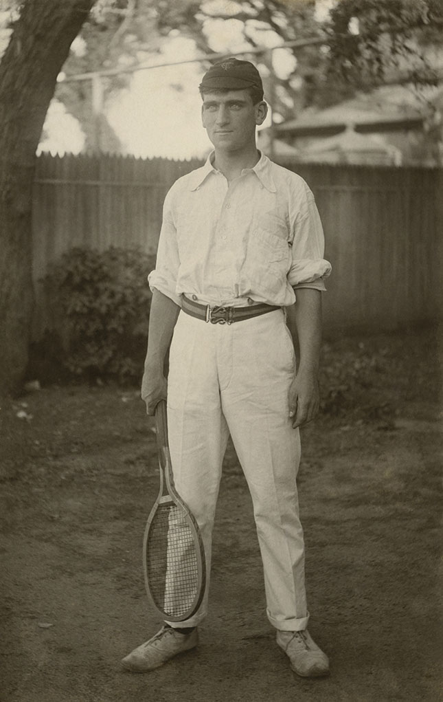 1916Young man in a white open necked, rolled sleeve shirt and white slim fitting, cuffed trousers. Striped belt, small dark cap and light shoes. Wooden tennis racquet held in right hand and resting on right instep. Fence and trees in background.