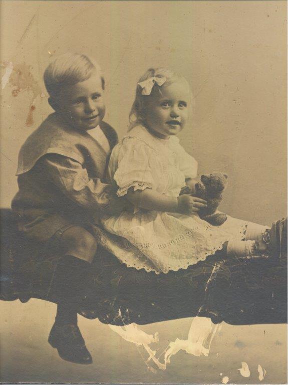 Sepia print. A small boy and girl, Ray and Amy Ledger, are sitting on the limb of a tree. Ray, in sailor suit, has his legs hanging over the tree and is holding his sister Amy, who is sitting in front of him holding a teddy bear. Amy is wearing a white broderie anglais dress, white ribbon in her hair and white socks.
