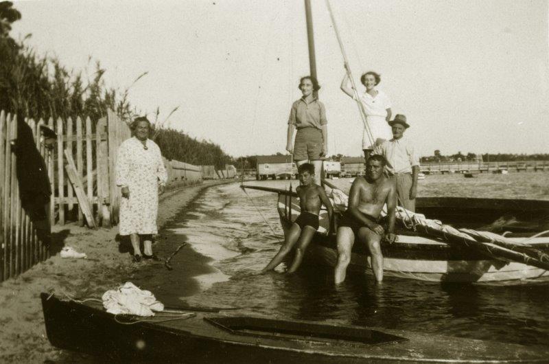 B/W print. Minnie Cooper is standing on the beach in front of a tall picket fence. A yacht with sails furled is pulled into shore in front of her. Trevor Cooper and his brother Max are sitting on the side of the yacht with their feet in the water. Dorrie Jones, her sister Lily and their father Tom are standing behind them . In the foreground is a canoe and on the left behind the fence is tall bamboo. In the background is the Claremont Jetty, with attached boat shed, and small boats anchored in the bay .