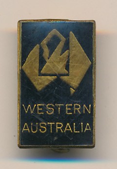 A rectangular shaped green enamel badge with a map of Australia in gold and in the middle of the badge is a gold swan. There is a pin at the back of the badge.