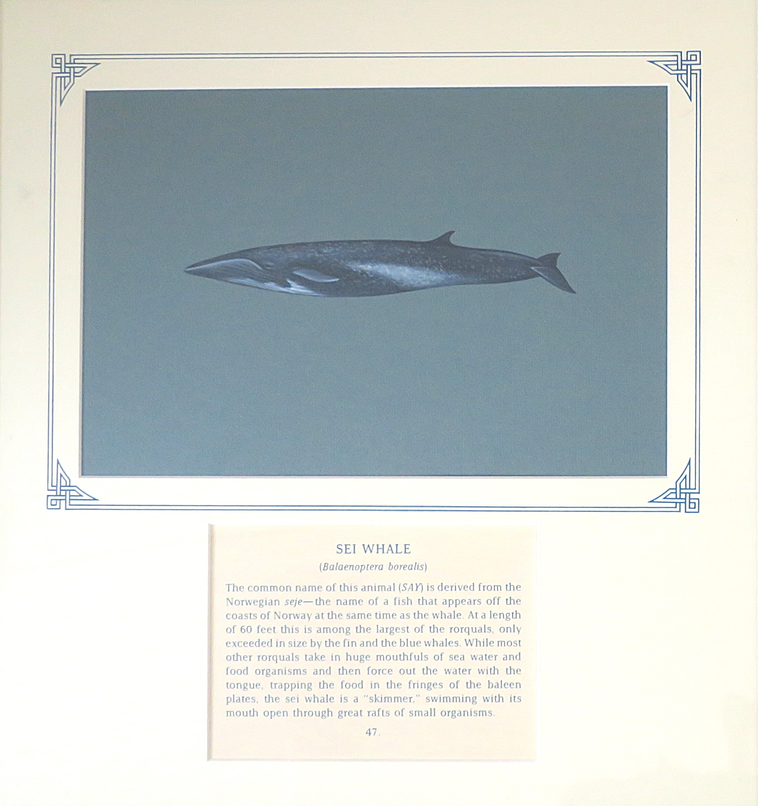 The common name of this animal (SAY) is derived from the Norwegian seje - the name of a fish that appears off the coasts of Norway at the same time as the whale. At a length of 60 feet this is among the largest of the rorquals, only exceeded in size by the fin and the blue whales. While most other rorquals take in huge mouthfuls of sea water and food organisms and then force out the water with the tongue trapping the food in the fringes of the baleen plates\, the sei whale is a "skimmer" swimming with its mouth open through great rafts of small organisms.