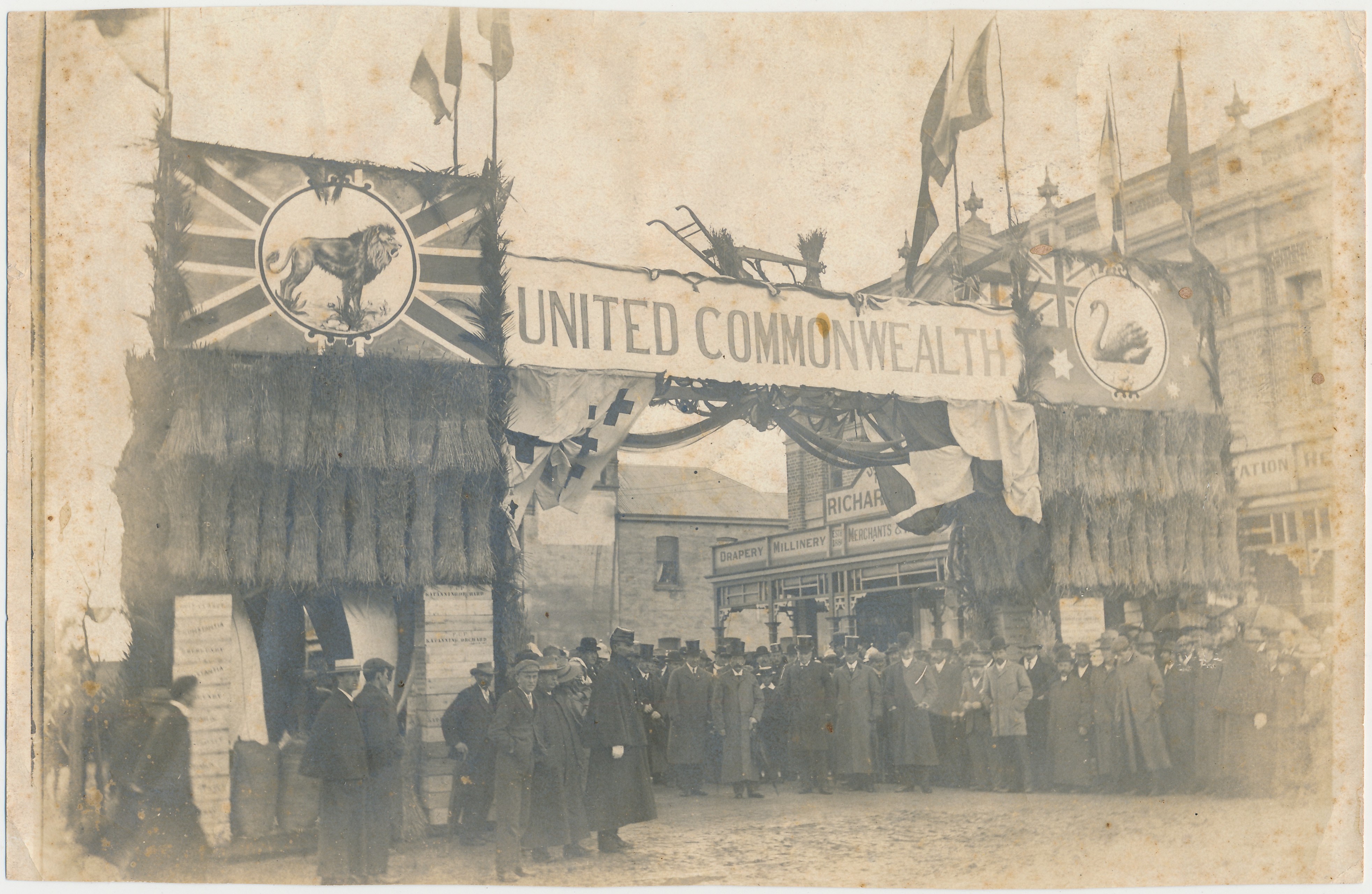 c. 1901A sepia photograph of a decorated archway above a road. The arch consists of two rectangular frames which are decorated with sheafs of wheat and joined across the road with a banner which reads "UNITED COMMONWEALTH". Above this banner is a single furrow plough with a sheaf of wheat. At the top of the left frame is a Union Jack flag and in the centre of the flag is a circle which has a lion in it. On the right frame is a flag which has the Australian Flag and in the centre of the flag is a circle which has a black swan in it.