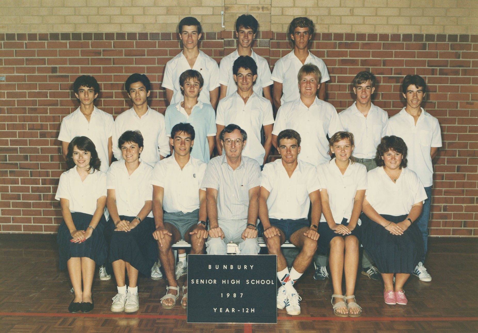 1987The Bunbury Senior High School Year 12H class photograph with teacher William Hannon (S.M. English).