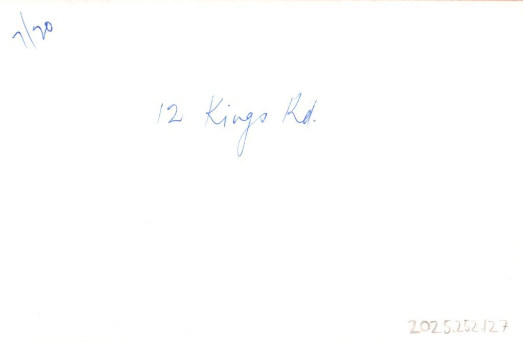 Reverse: Written on the reverse in blue pen '12 Kings Rd.' and '7/20'