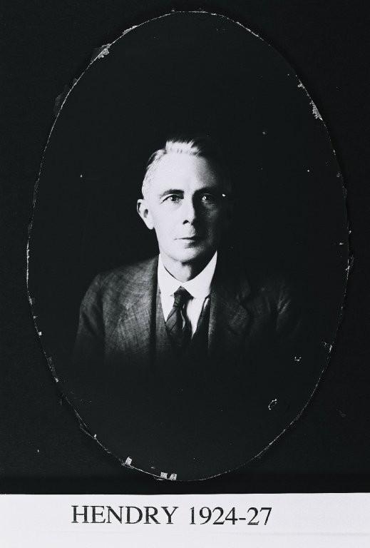 Black and white photograph of CA Hendry who served as a councillor at the Town of Claremont between 1924-27. Hendry is clean shaven with short hair slicked back off his face. He is wearing a dark jack, waistcoat and tie with a light coloured shirt. The lower half of the jacket is partially obscured. Printed beneath [Henry 1924-27].
