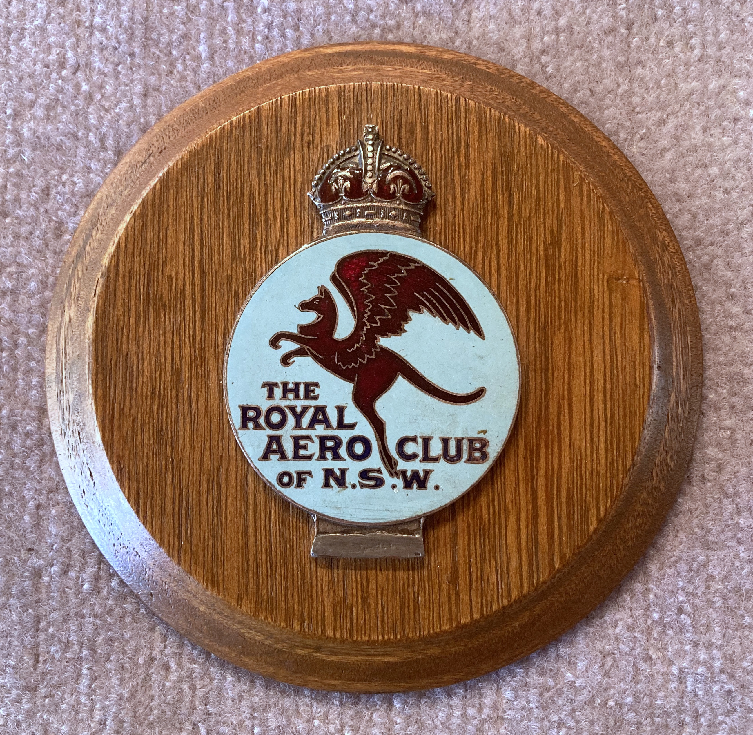 Royal Aero Club of N.S.W. car badge mounted on timber plaque
