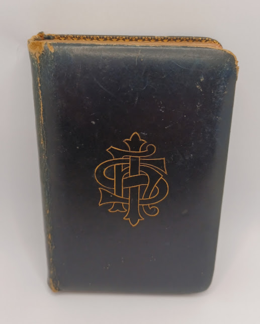 Pocket-sized black hardcover book with gold emblem at the front. 197 white pages of black typed text. Gold gilded on three sides of each page.