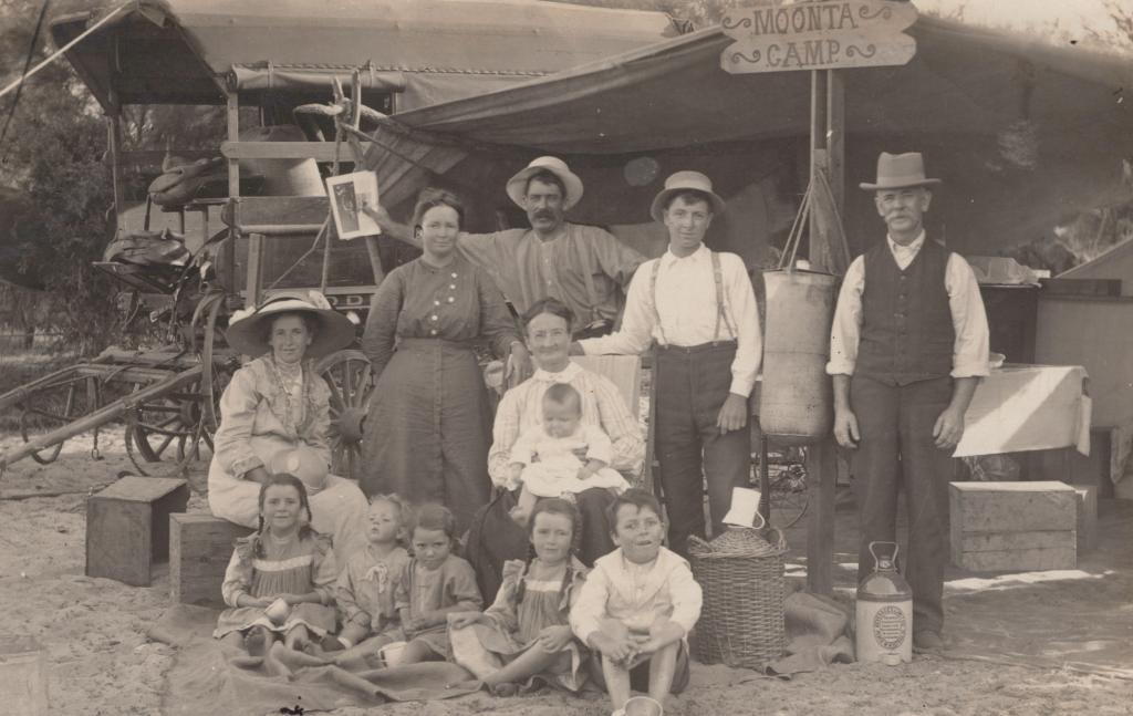 c. 1913Postcard showing a group of people including men, women and children. There is a sign in the image reading 'MOONTA CAMP'.