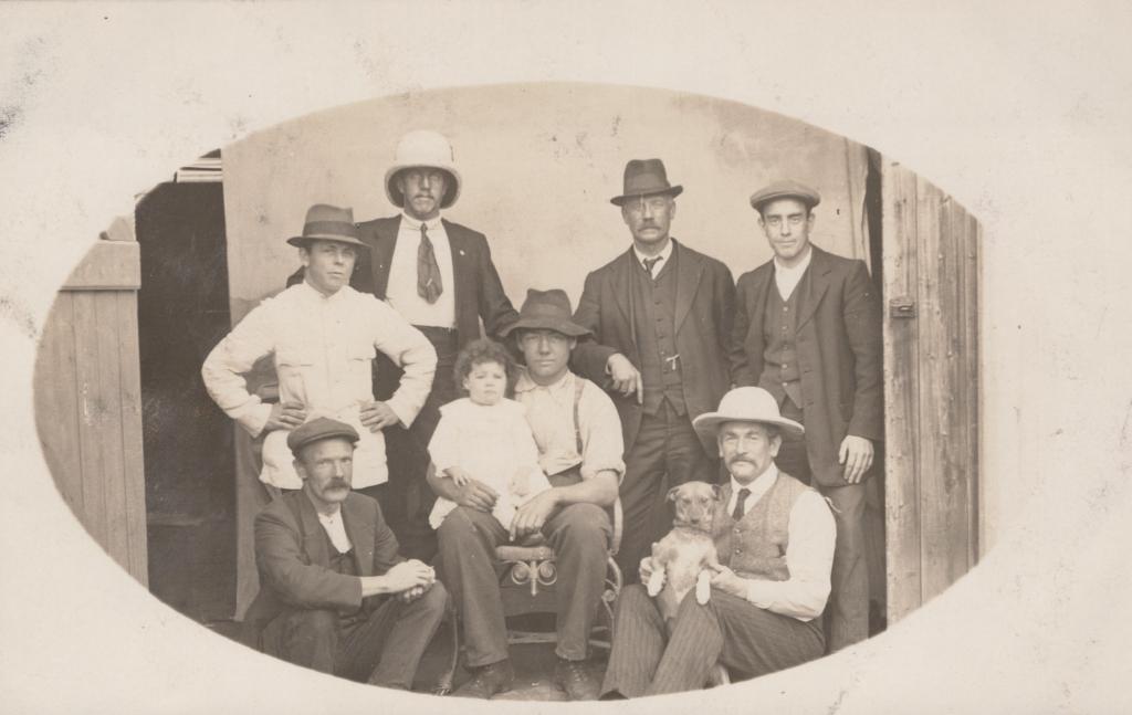 c. 1913Postcard showing a group of men. A baby is seen sitting on the lap of a man in the middle of the image. A man is seen holding a dog to the right.