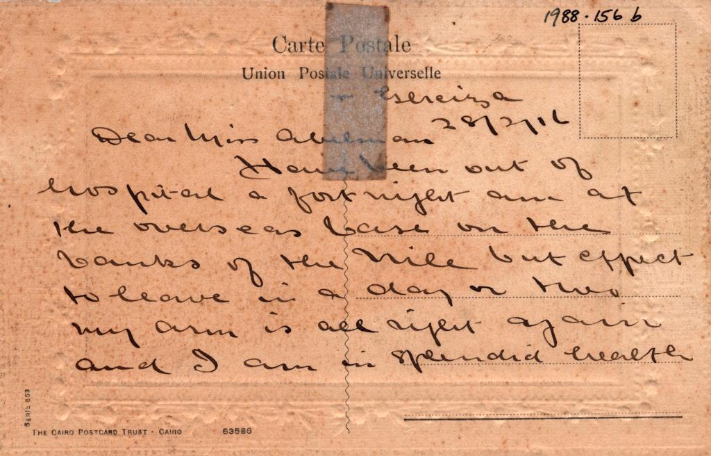 Posted 28/2/1916. Written on the reverse: 'R Gereiza - 28/2/16 Dear Miss Abelman - Have been out of hospital a fortnight, am at the overseas base on the banks of the Nile but expect to leave in a day or two. My arm is all right again and I am in splendid health.'