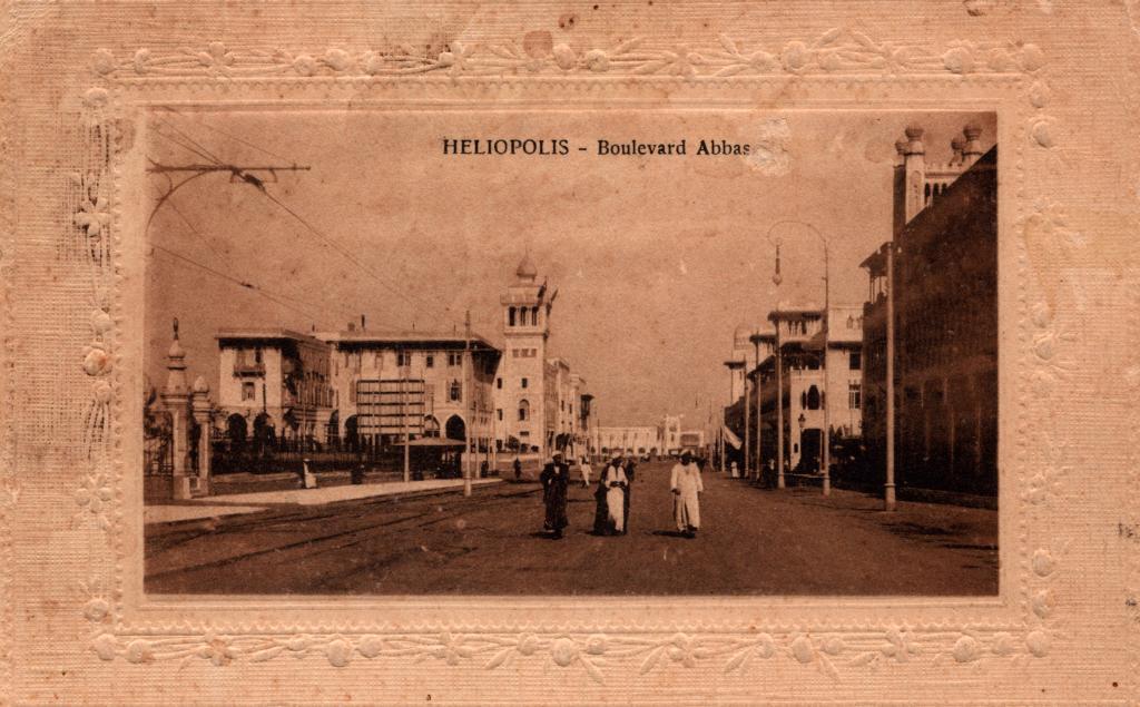 Sepia photograph of Helipolis - Boulevard Abbas, Cairo. Several mosques and minarets on the left and right of the street. Three figures in traditioanl white and black flowing robes in centre foreground. Embossed border of fruit and flowers. 'HELIOPOLIS - Boulevard Abbas' printed in centre top, just below border.