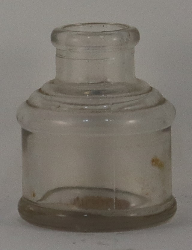 A small circular clear glass bottle, the opening is narrow.