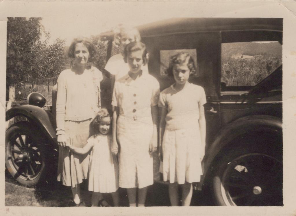 c. 1910Image: A photograph of Millie Trenberth (left), Dorothy Trenberth (centre left), Pat (centre right) and Valda (right). They stand together infront of a car, all wearing light colored shirts, and light colored skirts.