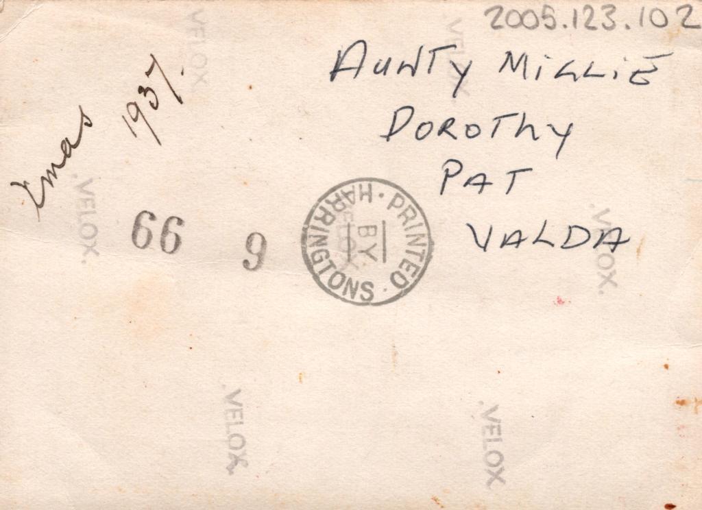 Reverse: Written in black pen, 'AUNTY MILLIE', 'DOROTHY', 'PAT', 'VALDA', 'XMAS 1937'.