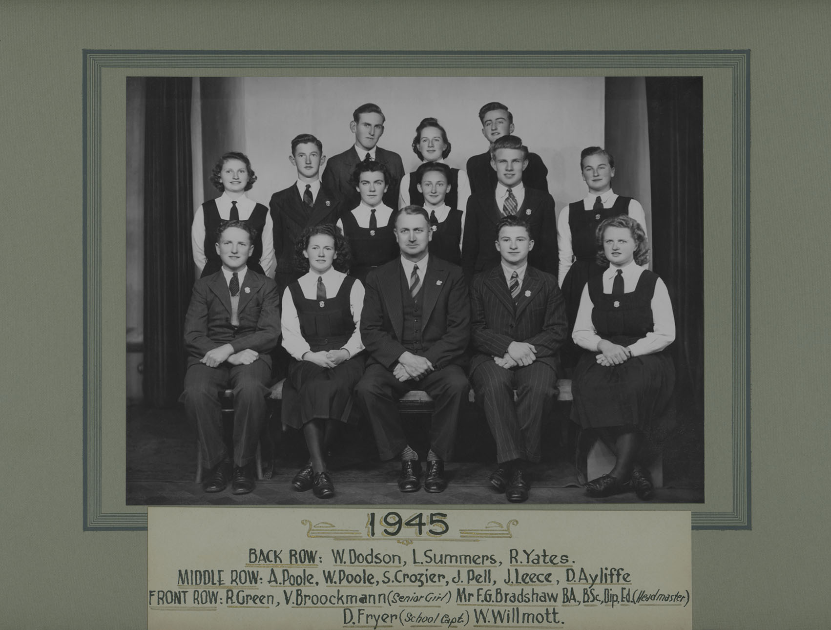 Front: R. Green, Valerie Brookmann (Senior Girl), Francis (Frank) G. Bradshaw (Headmaster), Dermott Fryer (School Captain), W. Willmott