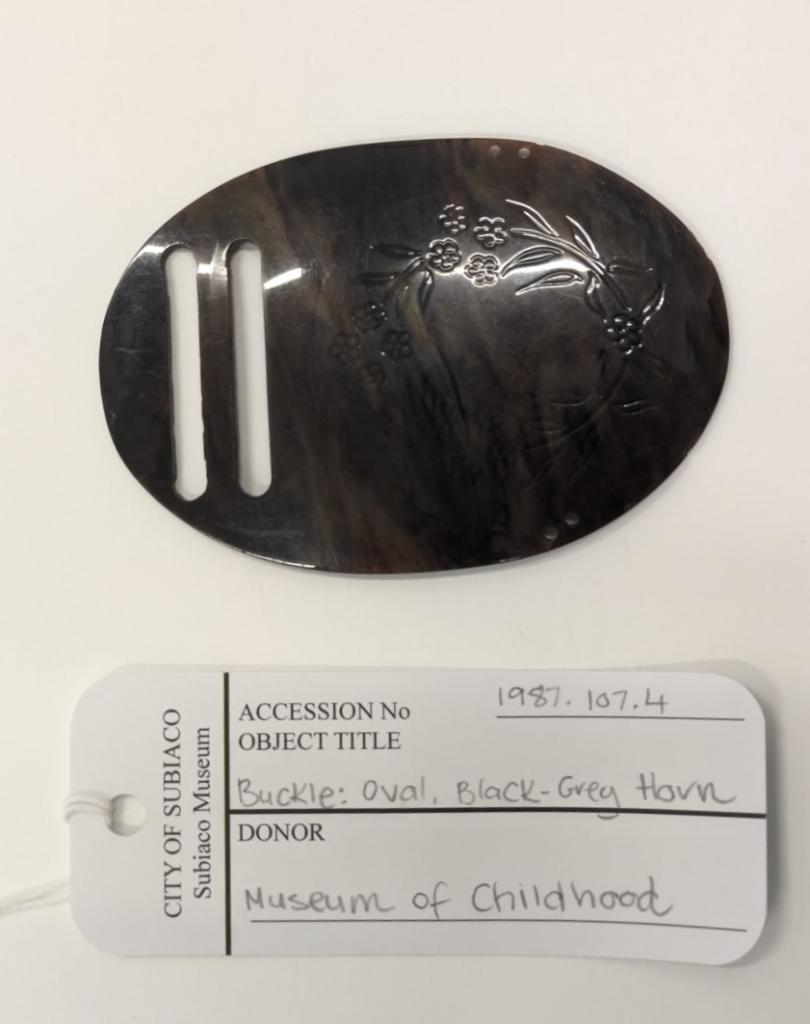 Oval, highly polished, black-grey horn. Two longitudinal slots and design of flowers and leaves in circular pattern.